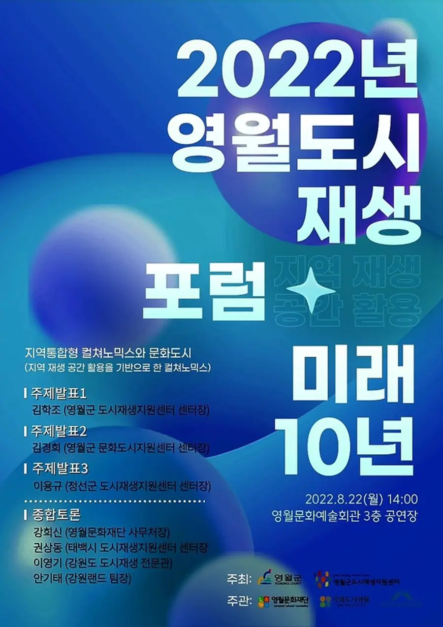영월군과 영월군도시재생지원센터는 22일 오후 2시 영월문화예술회관 3층 공연장에서 ▲지역통합형 컬쳐노믹스와 ▲문화도시를 주제로 ‘영월 도시재생 포럼(미래 10년)’을 개최한다.