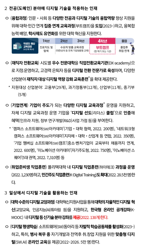 이러한 정책 상황에 대응해 첨단 디지털 산업 현장에서 일상생활에까지 필요한 역량을 갖춘 인재를 민‧관‧학이 양성할 수 있도록 다양한 정책과제를 발굴했다.