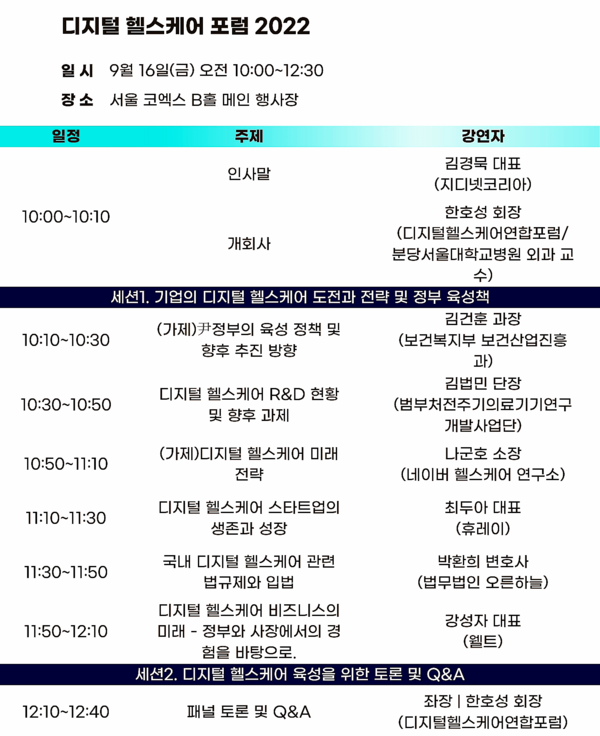 세션 발표 후에는 ‘디지털 헬스케어 육성’을 주제로 전문가 토론과 청중과의 질의응답 시간도 갖는다.