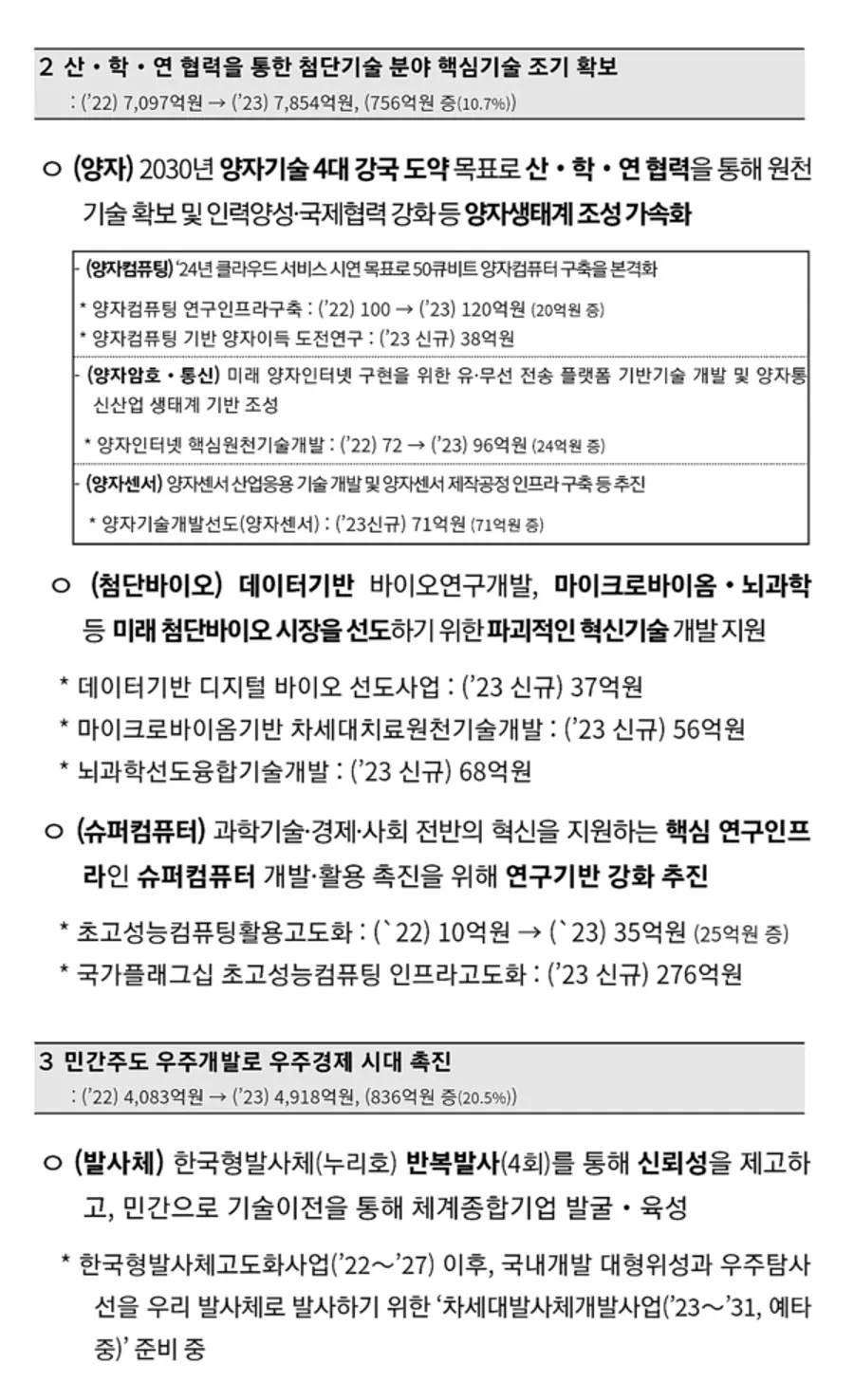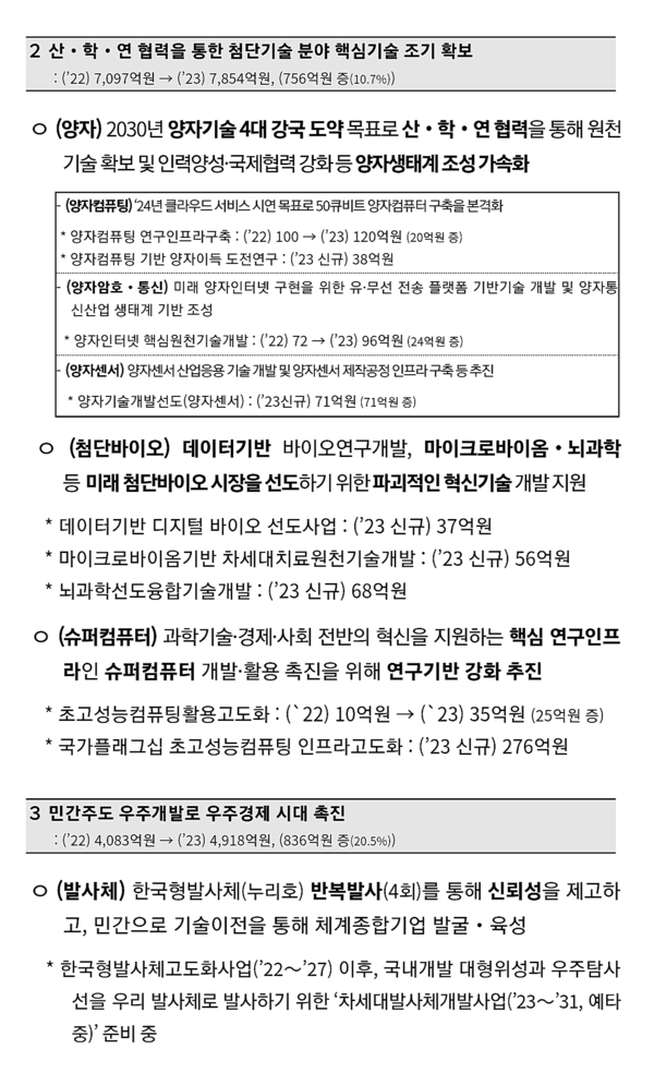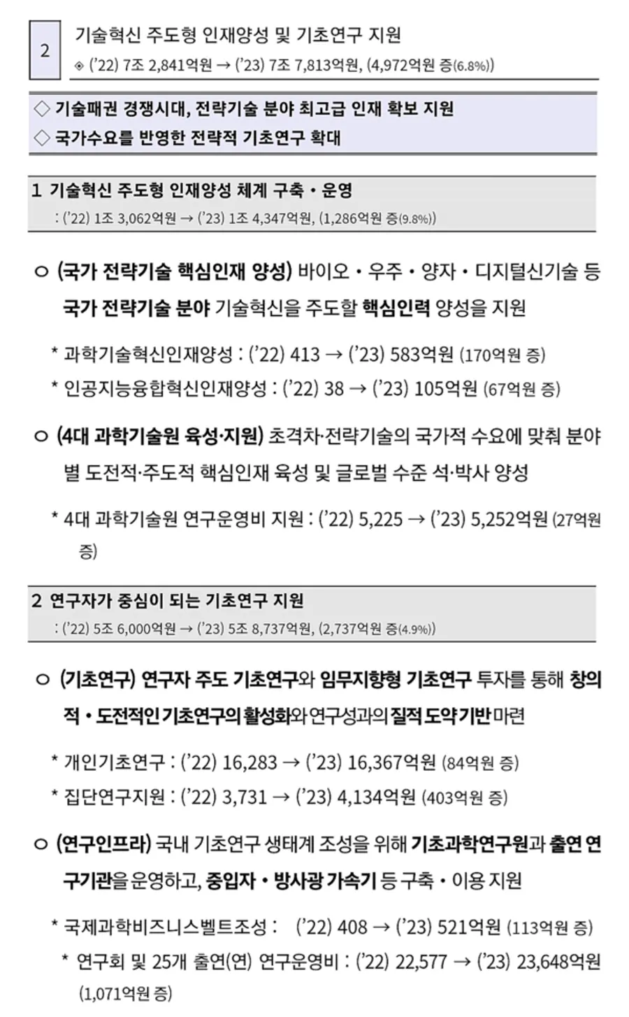 정부 건전재정 기조에 맞추어 성과미흡사업, 관례적 지원사업 등을 과감하게 구조조정 하였고, 구조조정으로 확보된 예산은 ▲초격차 전략기술 육성, ▲디지털플랫폼정부 구축, ▲인재양성 등 국정과제 실현을 위한 핵심 분야에 중점 투자할 방침이다.