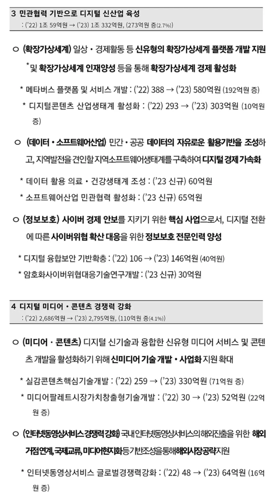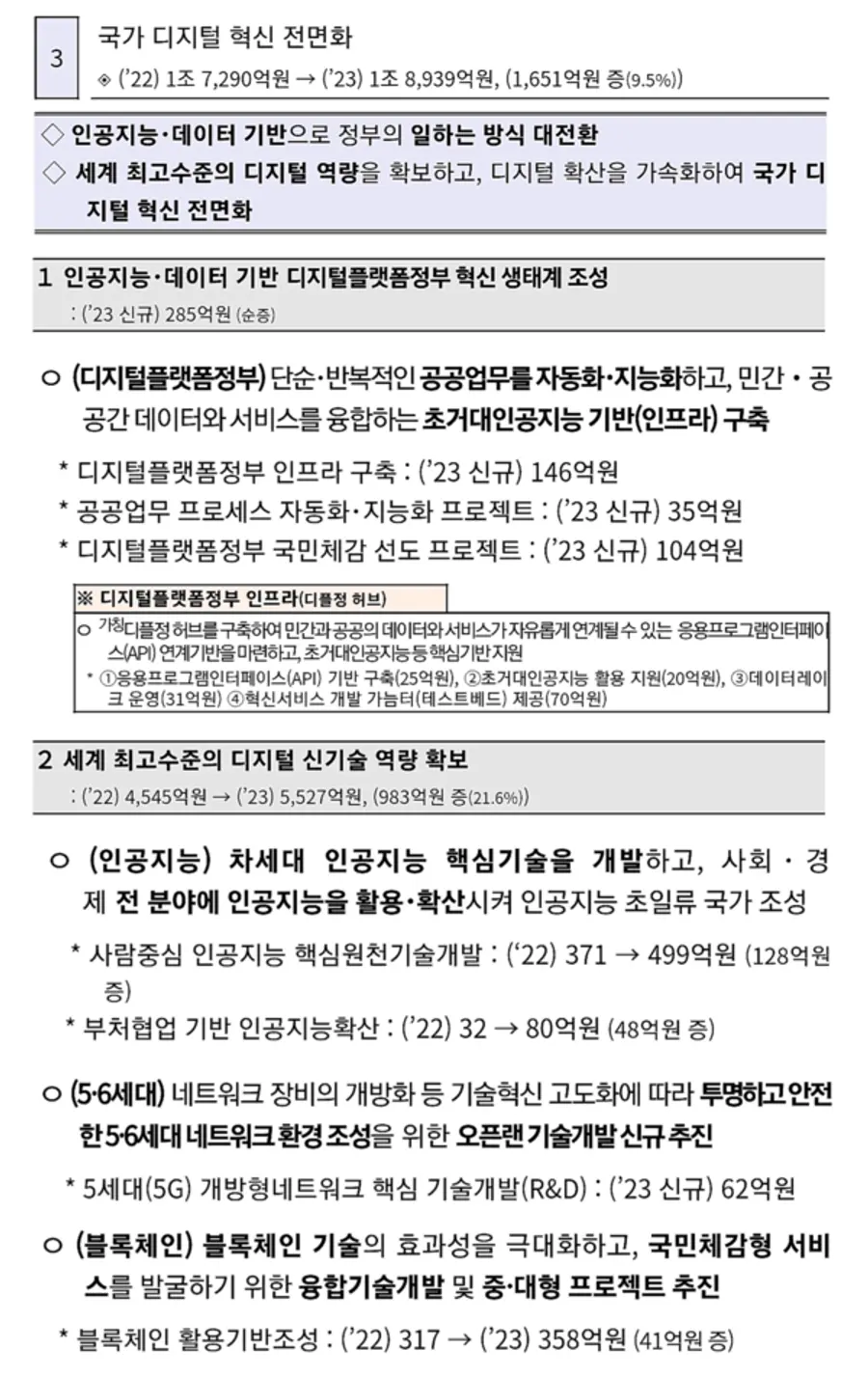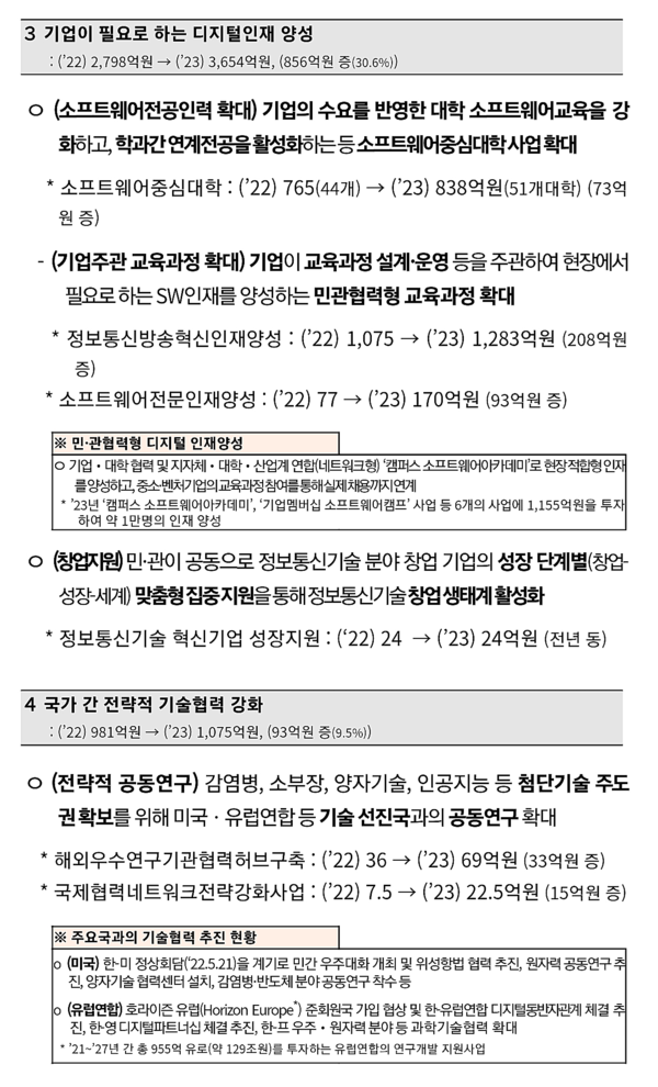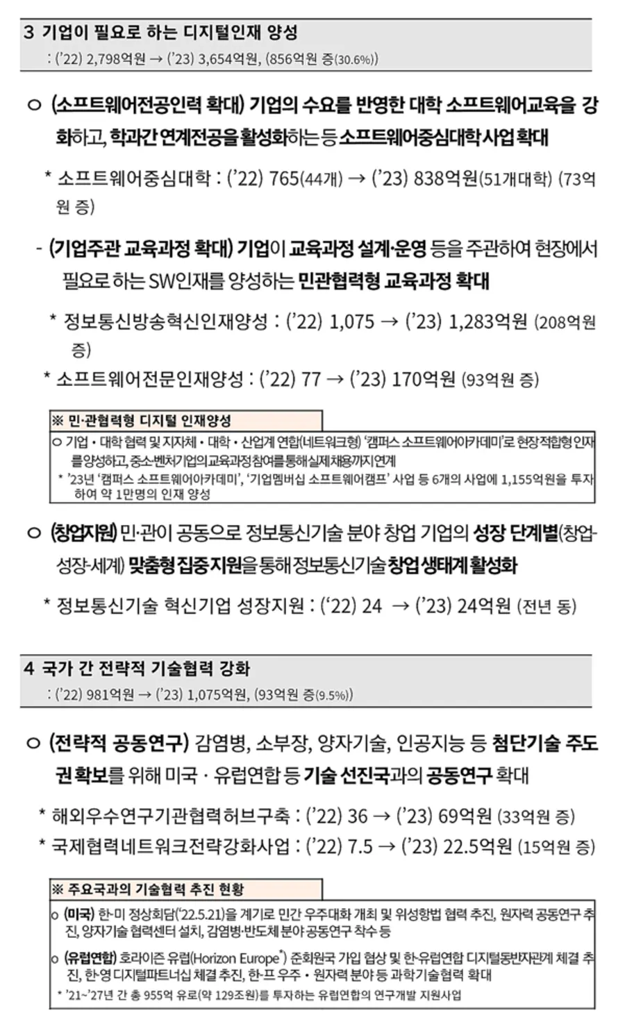 정부 건전재정 기조에 맞추어 성과미흡사업, 관례적 지원사업 등을 과감하게 구조조정 하였고, 구조조정으로 확보된 예산은 ▲초격차 전략기술 육성, ▲디지털플랫폼정부 구축, ▲인재양성 등 국정과제 실현을 위한 핵심 분야에 중점 투자할 방침이다.