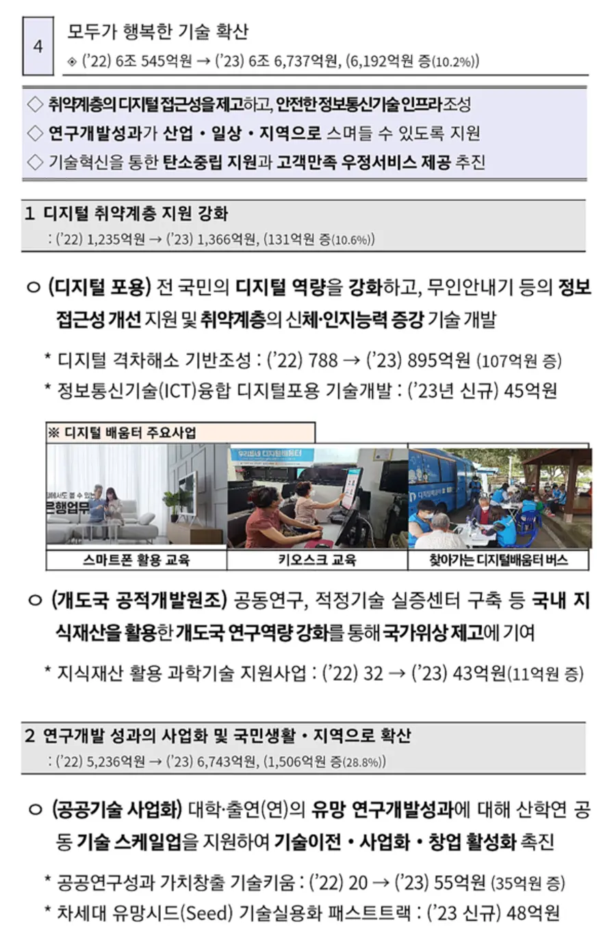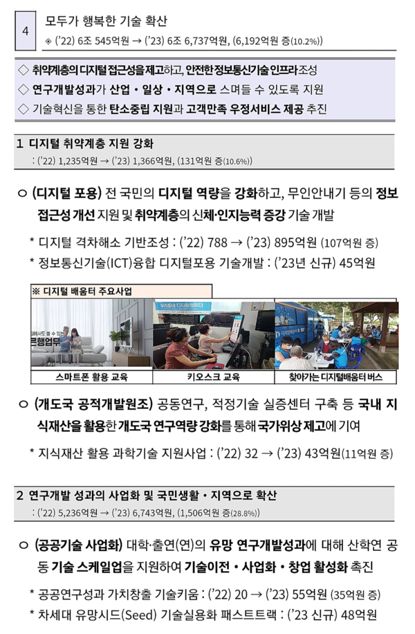 취약계층의 디지털 접근성을 제고하고, 연구개발성과를 산업·일상·지역으로 확산시키며, 탄소포집·저장·활용, 수소, 핵융합 등 탄소중립 실현을 위한 기술혁신에도 투자를 확대한다.