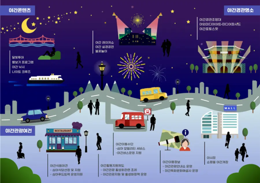 ‘야간관광 특화도시’는 관광객이 지역에 하루 더 머무르게 하여 지역경제를 활성화하고 세계적인 관광도시를 육성하기 위해 추진하는 사업이다.
