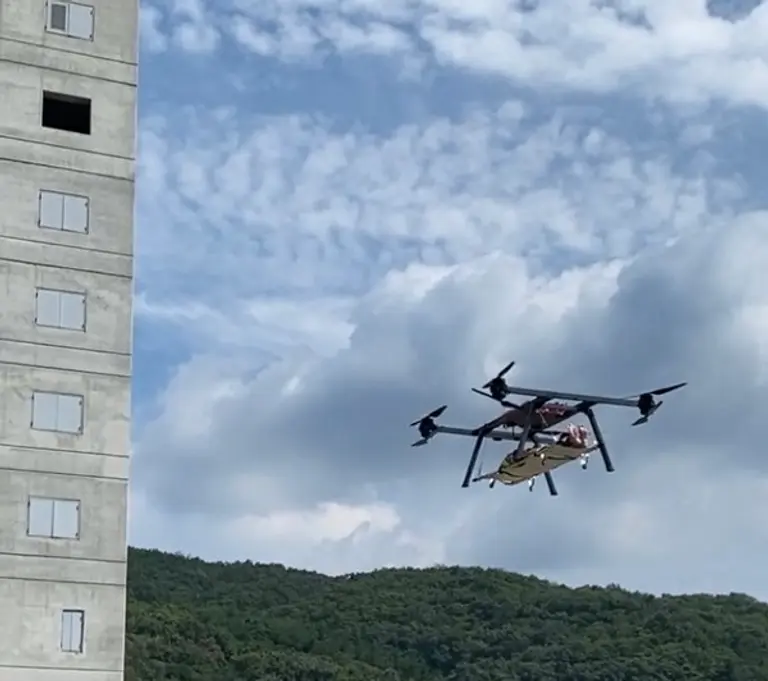 As a result of the verification, the fire extinguishing drone aimed exactly at the fire point of the high-rise building to extinguish the fire by releasing fire extinguishing agents, and the 2-meter stretcher drone took off from the ground, landed on the roof of the building, and transported the rescue target to a safe area.