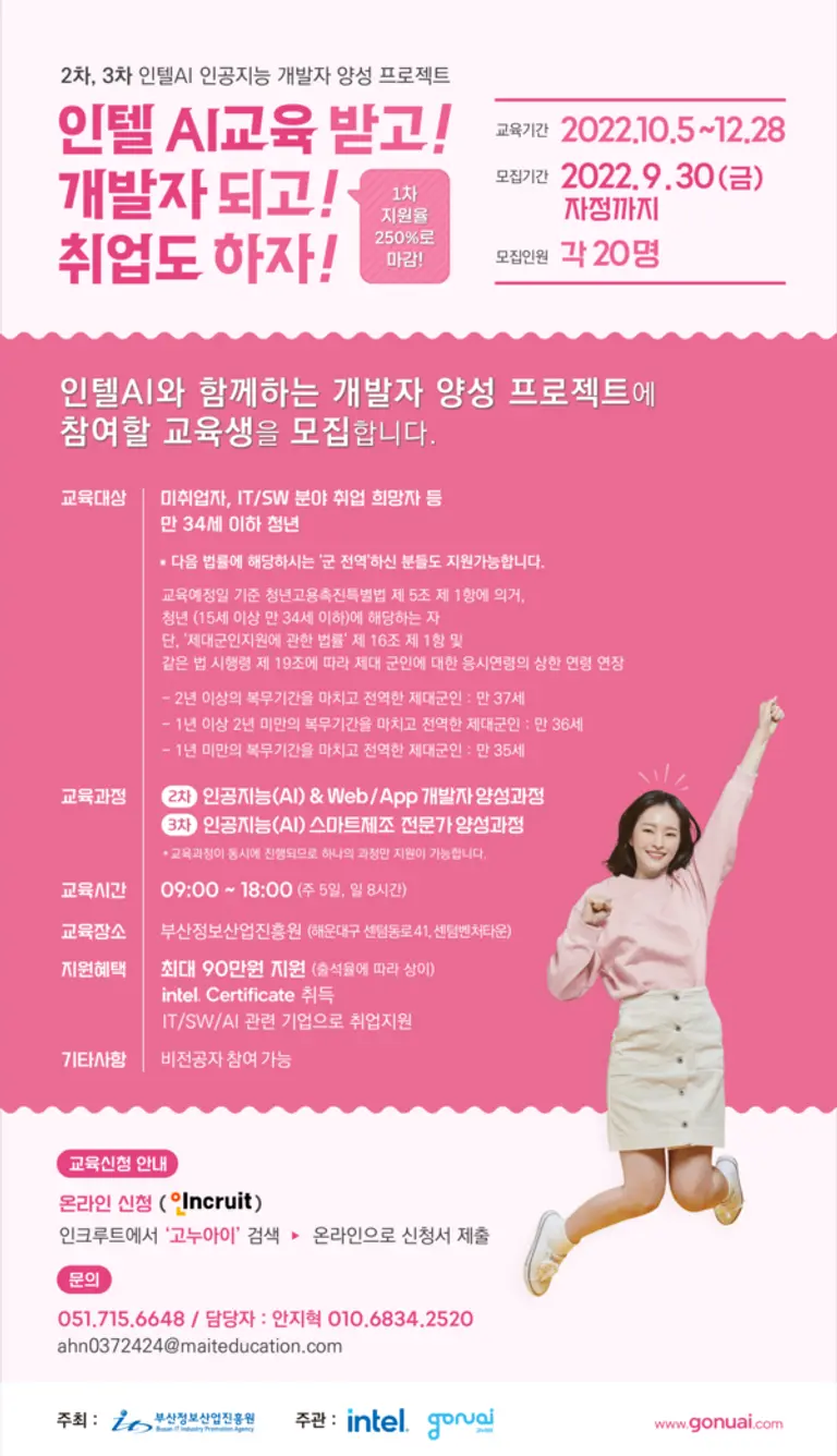 Gonuai runs this training course, Intel's Korea Agency for AI Education, as part of the training of Busan Information Industry Human Resources among the Busan Digital Innovation Academy, which is a high-end ICT talent development and employment-linked project for five years (2022-2026).