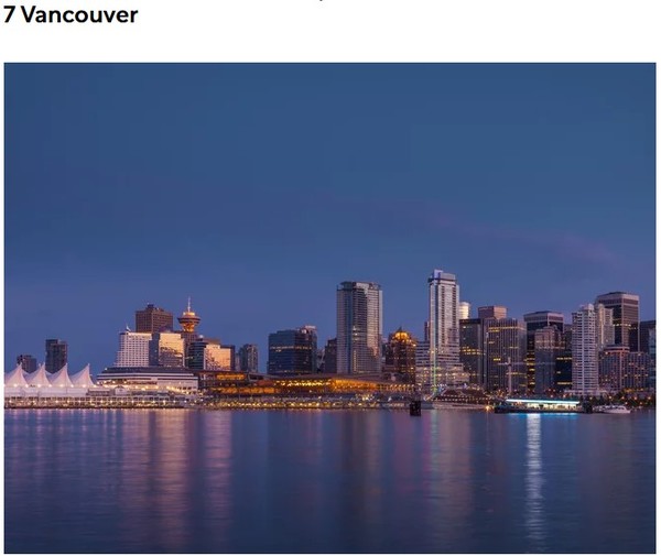 7위 밴쿠버는 지속가능한 에너지로 90% 이상 사용하고 있고, 북미 주요 도시 중 1인당 온실가스 배출을 가장 적게 하고 있다. 밴쿠버시는 실시간 감시 기술을 활용해서 연결성, 지속가능성, 편리성을 향상시킨 덕에 이런 성과를 이룰 수 있었다.