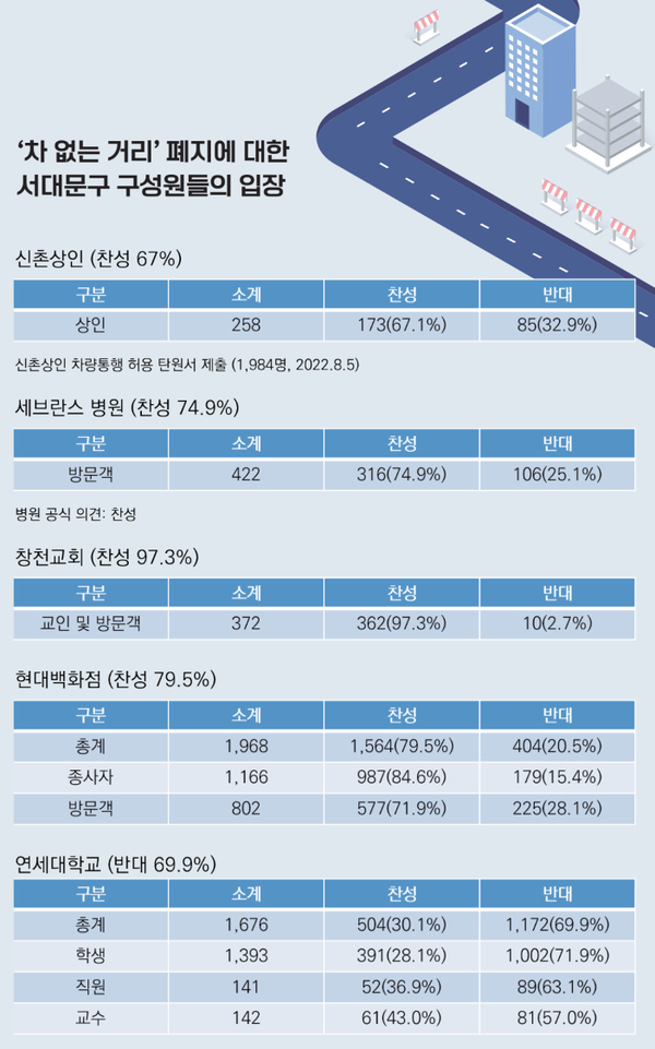 연세로 차량 통행 재개와 관련해 구내 구성원들의 의견은 엇갈리고 있다. 서대문구청이 연세로 차량 통행 재개와 관련해 최근 실시한 설문조사에 따르면 신촌상인(67%), 세브란스병원(74.9%), 창천교회(97.3%), 현대백화점(79.5%)의 경우에는 찬성이 우세했다. 반면 연세로를 가장 많이 이용하는 연세대 학생과 교직원들 사이에서는 반대한다는 의견이 높았다.