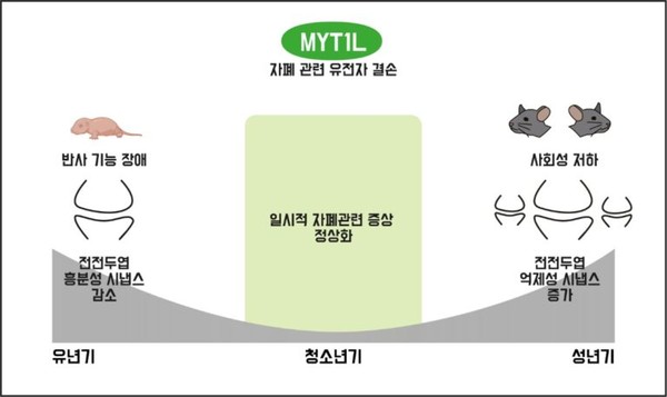 시냅스는 흥분성 시냅스와 억제성 시냅스로 구분되는데, 두 시냅스 간 균형이 깨지면 뇌 정신질환이 유발된다. 이와 달리 성체기 MYT1L 결손 생쥐의 뇌에서는 억제성 시냅수와 신호전달이 증가했다. MYT1L 유전자에 생긴 이상이 유년기에 뇌 변화를 일으키기 시작하고, 오랜 기간 축적되어 있다가 성체기에는 다른 메커니즘으로 자폐 증상을 유발한다는 의미다.