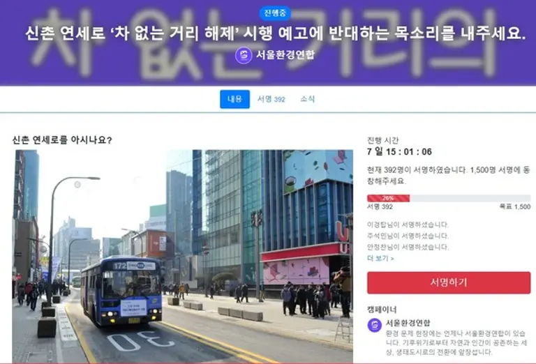 신촌 연세로의 '차 없는 거리 해제' 반대 서명이 봇물을 이루고 있다. ※관련기사 [거꾸로 가는 '차 없는 거리' 눈살](2022.09.23 12:03 ) 28일 서울환경연합(https://seoulkfem.or.kr, 이사장 최영식 문래예술공장 운영위원)에 따르면 지난 21일부터 시작된 서대문구의 행정 예고에 대해 현재까지 392명이 반대 서명을 했다.