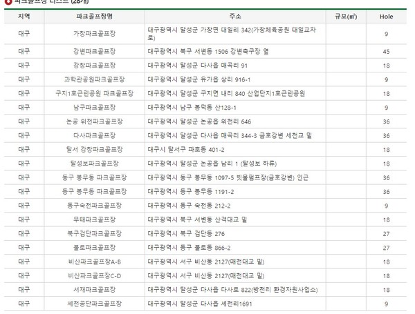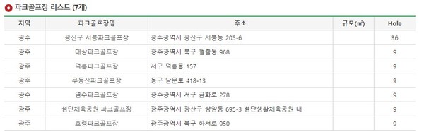 광역시급에서는 대구광역시가 28개 구장을 갖추고, 시민들에게 행복한 여가생활을 제공하고 있다. 서울(11개), 부산(10개), 울산(8개), 광주(7개), 인천(5곳), 대전(4곳) 순이다.