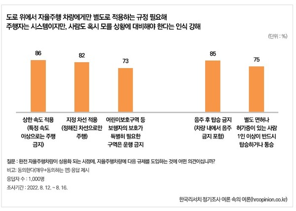 이러한 이유로 완전 자율주행 차량에 대한 별도 규제가 필요하다고 답했다. 86%는 상한속도를 적용해 특정 속도 이상으로 완전자율주행 차량의 주행을 금지해야 한다고 답했다. 자율주행차 지정 차선을 지정해 정해진 곳으로만 주행하도록 해야 한다는 응답도 82%로 높았다. 여기에 더해 어린이보호구역 등 보행자의 보호가 특별히 필요한 구역은 완전 자율주행차량의 운행 자체를 금지해야 한다는 데에도 73%가 동의했다.