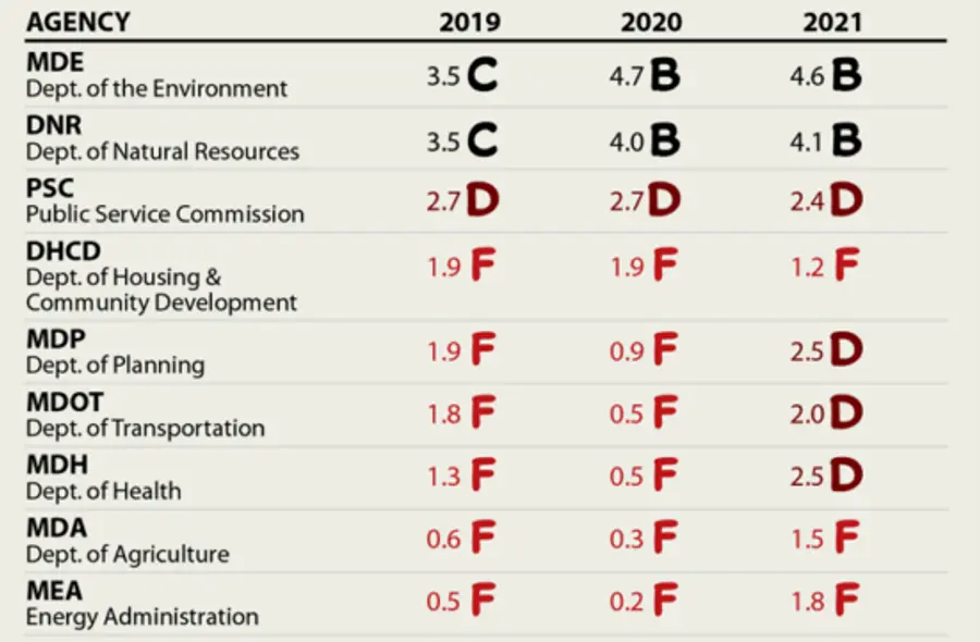 2019년, 2020년, 2021년에는 메릴랜드 주 환경부(MDE)와 천연자원부(DNR)만 C 및 B등급을 받았고, 공공서비스위원회는 3년 내내 D등급을, 나머지 6개 기관은 D와 F등급을 받았다. F등급 비중이 절대적이었다. 불행하게도 A등급은 어떤 부서도 받지 못했으며 농무부, 주택 및 지역사회 개발부 및 메릴랜드 에너지국은 연속 F등급을 받았다.