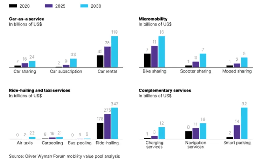 올리버 와이먼 포럼(Oliver Wyman Forum)과 캘리포니아 주립대학교 버클리(U.C. Berkeley) 교통연구소의 최근 연구에 따르면, 가장 인기 있는 13종의 새로운 모빌리티 서비스의 전 세계 연간 시장 규모는 2020년 2600억 달러(373조 6000억 원)에서 2030년 6600억 달러(948조 4000억 원)로 2.5배나 증가할 것으로 예상된다. 이 보고서는 프로젝트와 시장분석에서 협력하고 있는 세계경제포럼(WEF) 홈페이지에 요약 게재됐다.