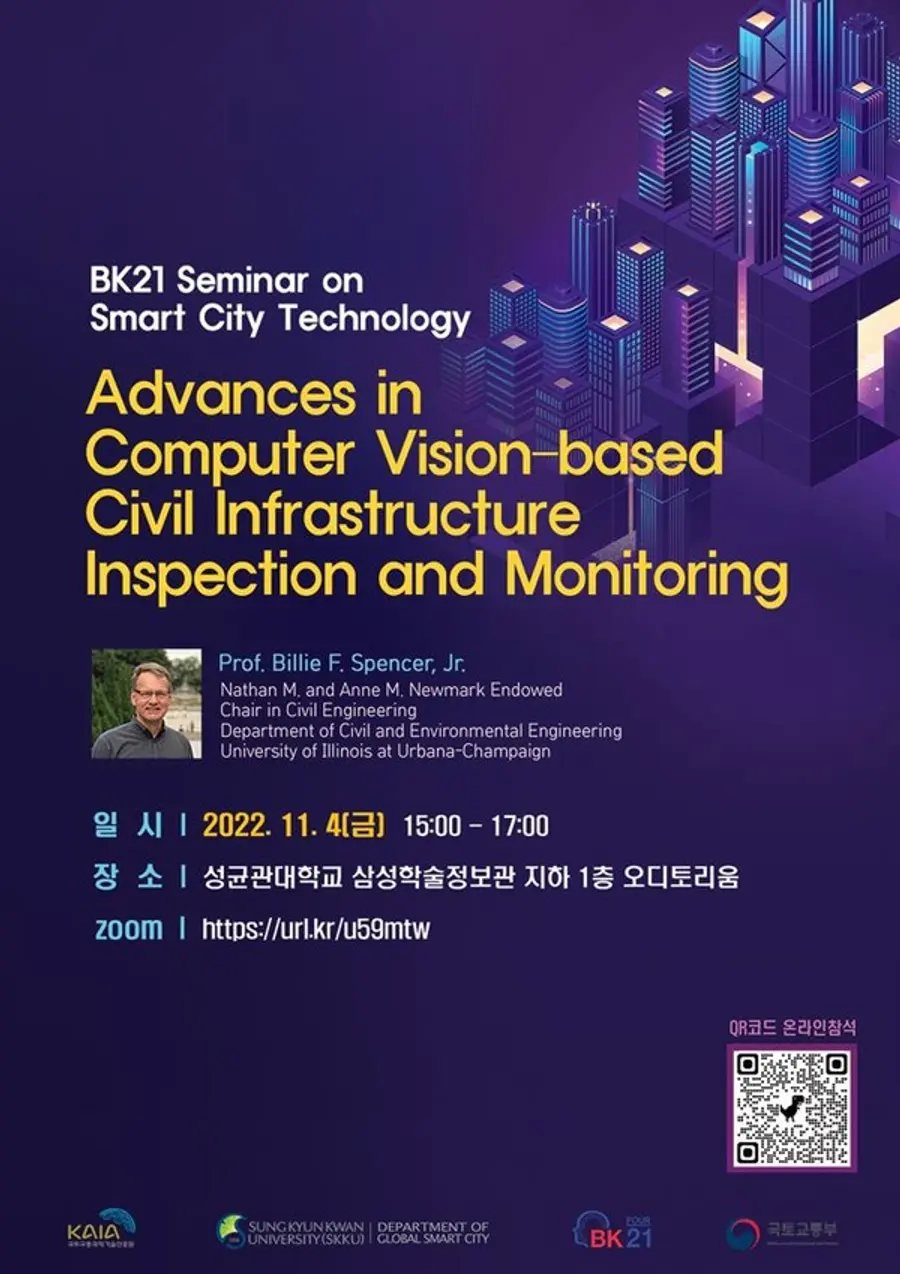 성균관대 글로벌스마트시티 융합전공이 주최하는 이번 세미나는 '컴퓨터 비전 기반 토목 인프라 점검과 모니터링'(Advances in Computer Vision-based Civil Infrastructure Inspection and Monitoring)'. 스펜서 교수가 2018년 저술한 책 제목이기도 하다.