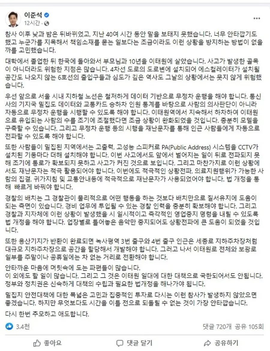이 전 대표는 “안타까운 마음에 머릿속에 도는 파편들이 많다”며 “이태원 일대에 대한 대책으로 국한되어서도 안 된다. 정부와 정치권은 신속하게 대책의 수립과 필요한 법 개정을 해나가야 한다”고 했다. 그러면서 “밀집지 안전대책에 대한 폭넓은 고민과 집중적인 투자로 다시는 이런 참사가 발생하지 않았으면 좋겠다. 하지만 무엇보다도 시간을 이틀 전으로 되돌릴 수 없는 것이 가장 안타깝다”고 했다.