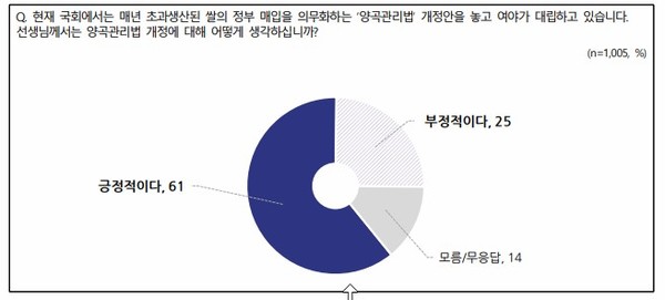 응답자의 61%가 양곡관리법 개정안이 쌀값 폭락을 막고, 식량자급률을 올리는데 도움을 줄 것이라며 법률 개정안에 대해 찬성한다는 의견을 피력했다. 반면 쌀의 과잉공급과 재정낭비를 초래할 것이므로 반대한다는 의견은 25%에 그쳤다. 지지정당, 이념성향에 관계없이 양곡관리법 개정안에 대해서는 긍정적 의견 비율이 높게 나타났다.