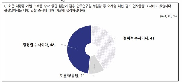 대장동 개발 의혹 관련 최근 검찰 수사에 대해서는 ‘부패 범죄에 대한 정당한 수사’라는 긍정적 의견이 48%로 ‘제1야당을 탄압하기 위한 정치적 수사(41%) 부정적 의견을 7%p 앞섰다.