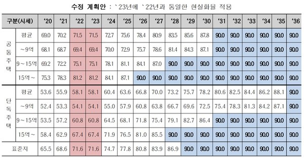 이에따라 내년 공동주택의 평균 현실화율은 71.5%. 가격 구간별로 △9억 원 미만 69.4% △9억~15억 원 미만 75.1% 15억 원 이상 81.2%다. 단독주택의 평균 현실화율은 58.1%로 △9억 원 미만 54.1% △9억~15억 원 미만 60.8% △15억 원 이상 67.4%다. 표준지는 71.6%의 현실화율이 적용된다.