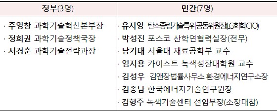 과기정통부 과학기술혁신본부장을 위원장으로 LG화학 CTO, 포스코 산학협력실장, 한국에너지기술연구원 원장, 김앤장 법률사무소 환경에너지연구소장, 서울대학교‧한국과학기술원 교수 등 전문가 10명이 참여한다.