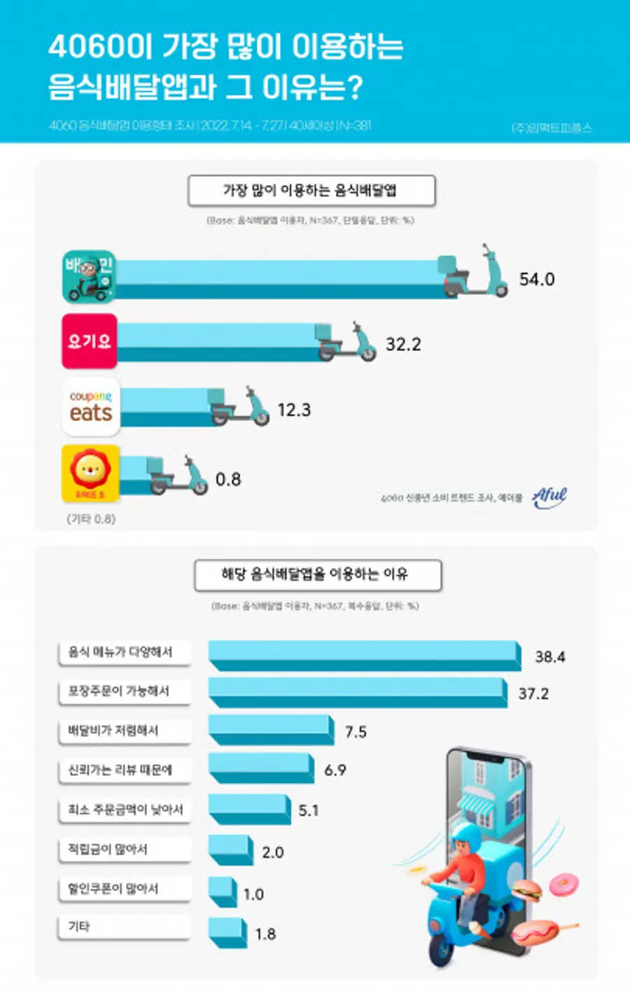 임팩트피플스는 에이풀(Aful)을 통해 지난 7월14일부터 27일까지 4060 남녀 380명을 대상으로 음식 배달 앱 이용 트렌드 조사를 진행했다.