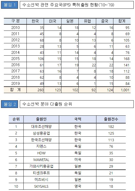 특허청은 수소사회로의 전환에 대비하는 조선업계의 기술개발과 특허전략수립에 도움을 주기 위하여 『수소선박』을 발간하였다.
