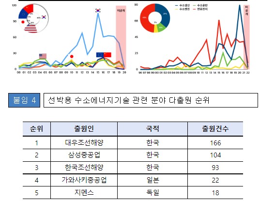 수소선박 관련 국내 특허출원의 경우 2010년 이후 점차 증가하고 있다. 국내 대형 조선3사가 전체 출원의 대부분을 차지하고 있다. 향후, 수소시장의 성장과 수소선박 수요 증가가 예상되면서 관련 시장을 선점하기 위한 국내외 기업들과의 경쟁이 심화되고 있다.