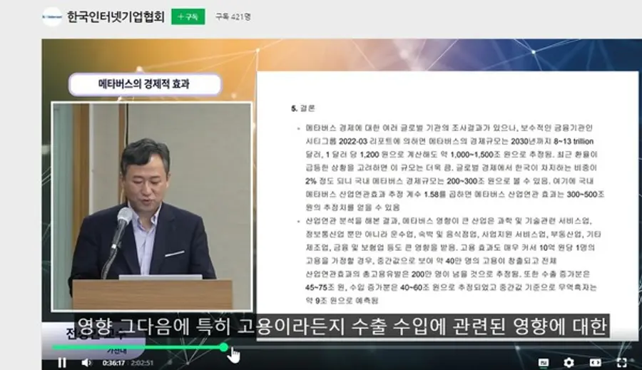 '메타버스 산업, 그 길을 묻다'란 주제로 열린 세미나 주제 발표를 맡은 그는 글로벌 금융사인 씨티그룹의 경제전망 리포트가 2030년까지 메타버스 시장 규모로 8조에서 13조 USD를 추정했고, 이를 기준으로 우리나라의 전세계 산업 기여도 등을 감안해보면 2030년 국내 메타버스 연관 시장 규모가 300조에서 최대 500조원 규모까지 추정된다고 설명했다.