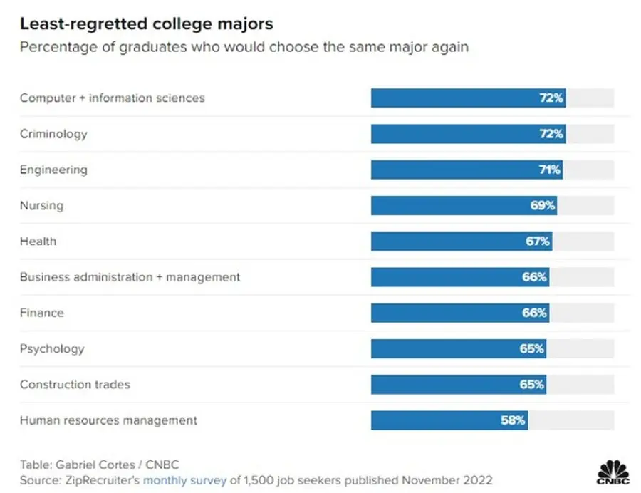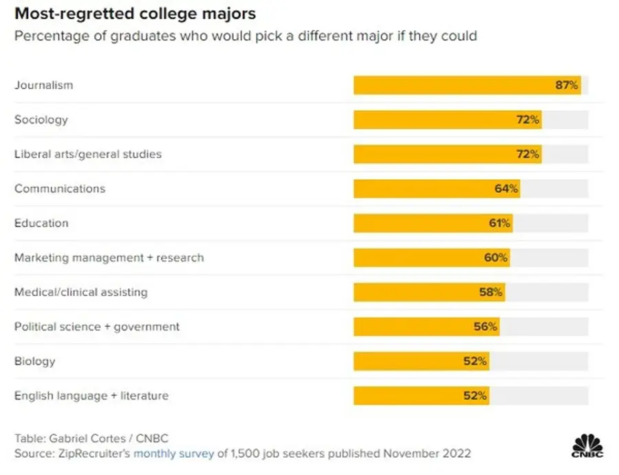 15일 미국의 취업포탈 집리쿠르트(Zip Recruiter)가 구직중인 1500명 이상의 대학 졸업생들을 대상으로 조사한 결과를 전한 CNBC에 따르면 언론과 사회, 교육학과 등의 전공자들이 자신의 대학 전공을 가장 후회하고 있는 것으로 꼽혔다. 이들은 다시 전공을 선택할 수 있다면 컴퓨터 공학이나 경영학을 선택하겠다고 말했다. 졸업 이후 높은 임금을 받을 수 있는 전공으로 갈아타겠다는 것이다.