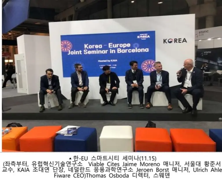 또한, 한국관에서 한-스페인-네덜란드 스마트시티 협력 세미나와 한-EU 스마트시티 공동세미나를 개최(11.15)하여 스마트시티 추진전략, 데이터 표준, 연구개발 지원 등 다양한 정책을 교류하고, 스마트시티를 추진 중인 지자체 간(부산-바르셀로나), 관련기관 간(KOTRA-RECi(스페인 스마트시티 네트워크), KAIA-유럽혁신기술연구소 등) 국제협력을 다지는 기회로 삼았다.