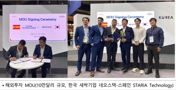 이를 통해 국내기업들은 100여 건의 해외 투자자·정부와의 기업상담을 진행하였으며, 무선 스마트 조명 솔루션을 제공하는 국내 새싹기업 ‘네오스택’은 스페인의 태양광 가로등 기업 ‘스타리아 테크놀로지(STARIA Technology)’와 10만달러 규모의 시범사업 MOU를 체결하는 성과를 거두었다.