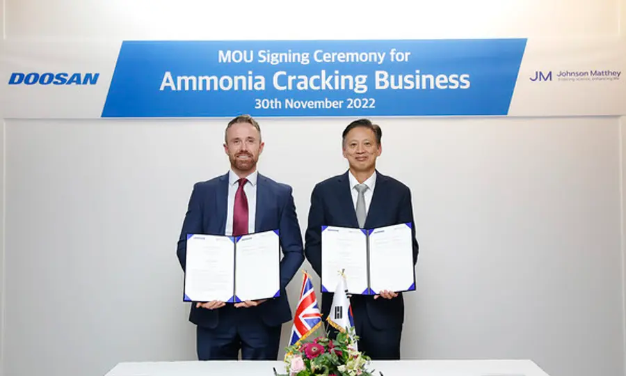 1일 두산에너빌리티는 영국 암모니아 크래킹 솔루션 업체 존슨 매티(Johnson Matthey, 이하 JM)와 ‘암모니아 크래킹 사업 협력을 위한 업무협약(MOU)’을 체결했다.