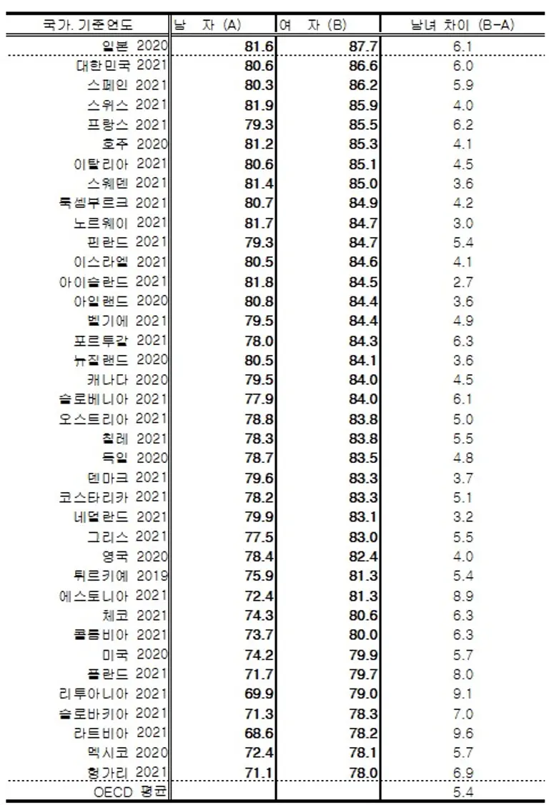 우리나라 남자의 기대수명(80.6년)은 OECD 평균(77.7년)보다 2.9년, 여자의 기대수명(86.6년)은 OECD 평균(83.1년) 대비 3.5년 긴 것으로 조사됐다.