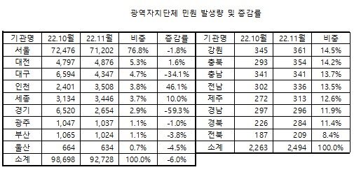 광주광역시 중에서는 북구에서 가장 많은 민원(10,655건)이 접수됐다.