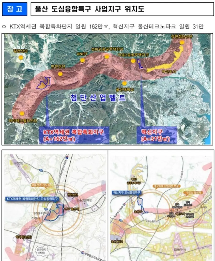 이번에 사업지로 선정된 울산 도심융합특구(약 193만㎡)는 울주군 울산 KTX역세권과 중구 테크노파크 일원으로 하이테크산단, UNIST, 울산대학교, 혁신도시, 장현도시첨단산단 등과 인접해 우수한 산학연 인프라를 활용할 수 있다.