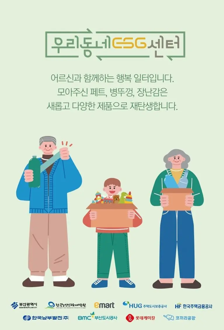부산시의 우리동네 ESG(Echo Senior Group)센터 활동이 화제다. '우리동네 ESG'는 폐플라스틱을 재활용하고, 이 과정에서 지역노인들에게 일자리를 제공하는 것이 골자이다.