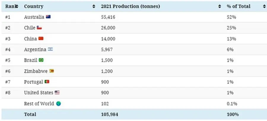 지난 20년간 글로벌 시장에서 최대 리튬 생산국 순위에 변동이 있었다. 1990년대 미국은 지금과 달리 최대 리튬 생산국 자리를 점하고 있었다. 미국은 1995년에 세계 리튬 생산량의 3분의 1 이상을 차지했다. 이후 2010년까지는 칠레가 세계에서 가장 풍부한 리튬 매장지 중 하나인 살라르 데 아타카마에서 생산 붐을 일으키며 최대 생산국 자리를 꿰찼다. 지금은 호주에게 최대생산국 자리를 빼앗겼다.
