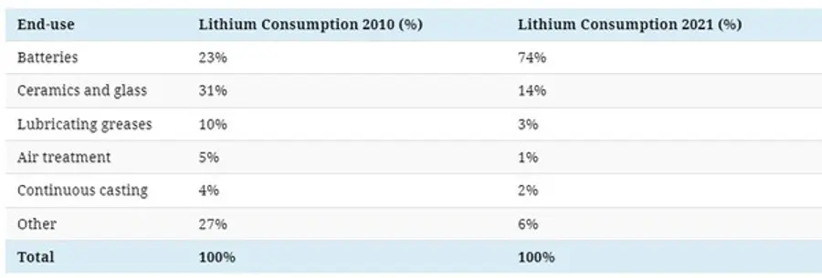 10년전(2010년) 리튬은 주로 세라믹과 유리를 만드는데 가장 많이 사용됐다. 비중은 31%로 가장 많았다. 세라믹 및 유리 제품에서 탄산 리튬은 강도를 증가시키고, 열팽창을 감소시키는데, 이는 현대 유리 세라믹 조리대에도 필수적으로 활용중이다. 리튬은 운송, 철강, 항공 산업등에서 주로 윤활유 재료로도 사용되고 있다.