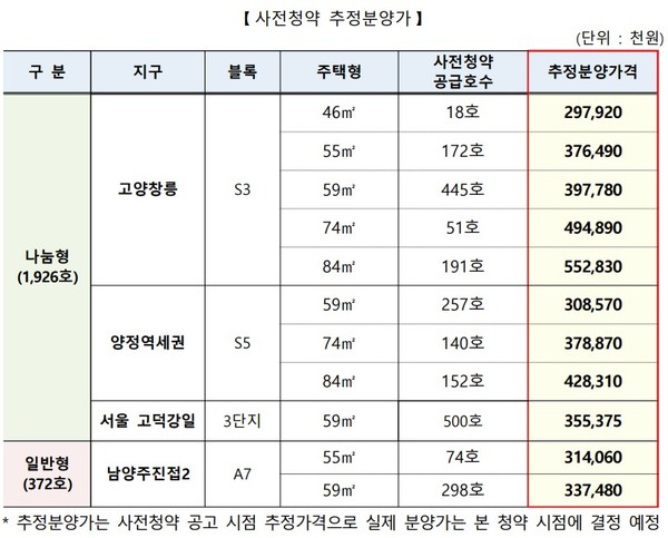 사전청약 추정분양가는 분양가 상한제에 따라 산정되며, 이번 3개지구는 전용면적 60㎡ 이하의 경우 2~3억원대, 전용면적 74㎡~84㎡의경우 3~5억원대 수준으로 산출됐다.