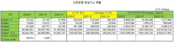 신한은행의 지난해 상반기 탄소배출량이 4180만 tCO2eq에 달하는 것으로 나타났다. 2000년과 2021년 탄소배출량은 각각 3663만tCO2eq과 4000만tCO2eq이었다.