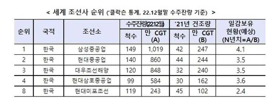세계 조선사 순위에서 국내 업체가 상위권을 휩쓸었다. 고부가, 친환경 선박 시장 점유율 1위를 달성했다. 국내 조선사 맏형격인 HD현대(옛 한국조선해양) 계열인 현대중공업, 현대미포, 현대삼호는 197척(240억불)을 수주해 당초 목표(174.4억불) 대비 38%를 초과하는 실적을 거뒀다.