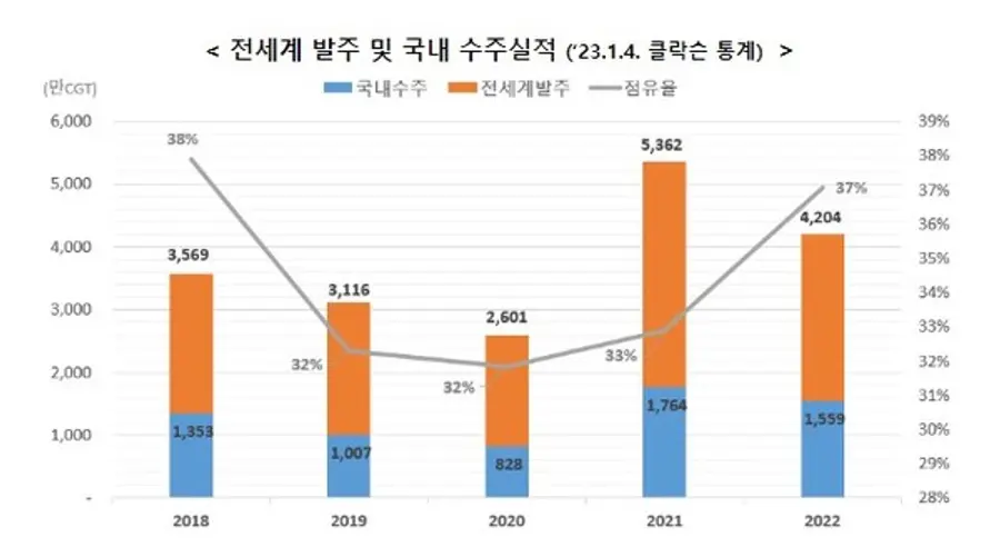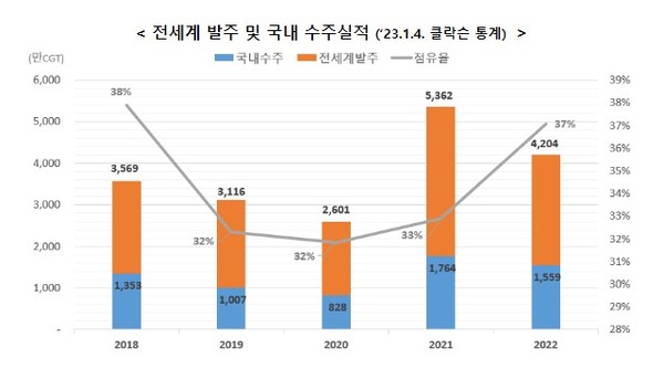 2022년은 전년비 전세계 발주량이 22% 감소했지만 우리 조선산업의 세계 시장 점유율은 거꾸러 4%p 높은 37%를 달성했다.