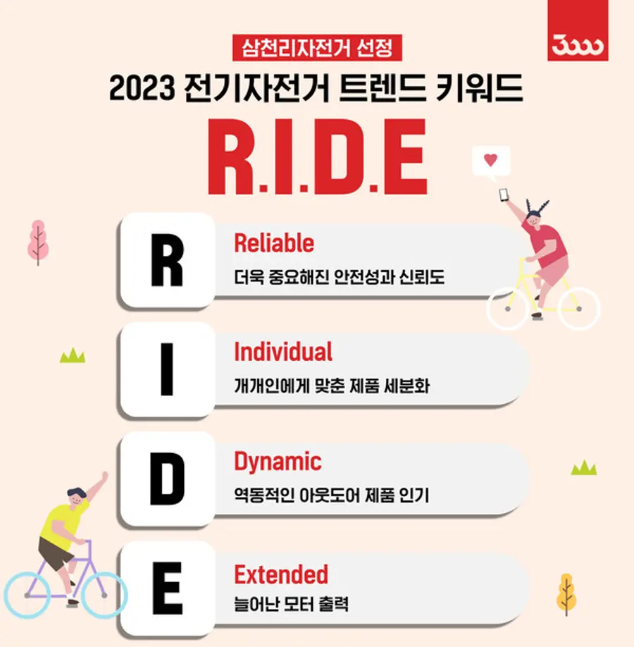 자전거 전문 기업 삼천리자전거(대표이사 신동호)는 연간 고객 구매 데이터 및 시장 흐름 분석을 바탕으로 2023년 전기자전거 시장을 관통할 트렌드 키워드로 R.I.D.E로 선정했다. ‘R.I.D.E’는 ▲더욱 중요해진 안전성과 신뢰도(Reliable) ▲개개인에게 맞춘 제품 세분화(Individual) ▲MTB부터 로드까지 아웃도어 제품 인기(Dynamic) ▲늘어난 모터 출력(Extended) 등 네 가지를 뜻한다.