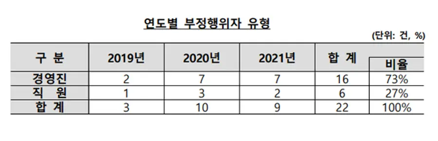 최근 3년간 외부감사 과정에서 감사인이 부정을 발견한 사례는 총 22건이었다. 경영진에 의한 부정이 16건, 73%로 대부분을 차지했고, 직원에 의한 부정은 6건, 27%를 차지했다.