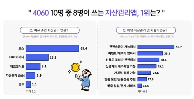 신중년이 이용하는 자산관리 앱 1위는 ‘토스(69.4%)’가 차지했다. 토스는 국내 핀테크 스타트업 기업인 비바리퍼블리카가 운영하는 서비스로 ‘간편 송금’ 기능을 선도했다. 2위는 ‘KB마이머니(15.3%)’, 3위는 ‘뱅크샐러드(8.1%)’로 나타났다.