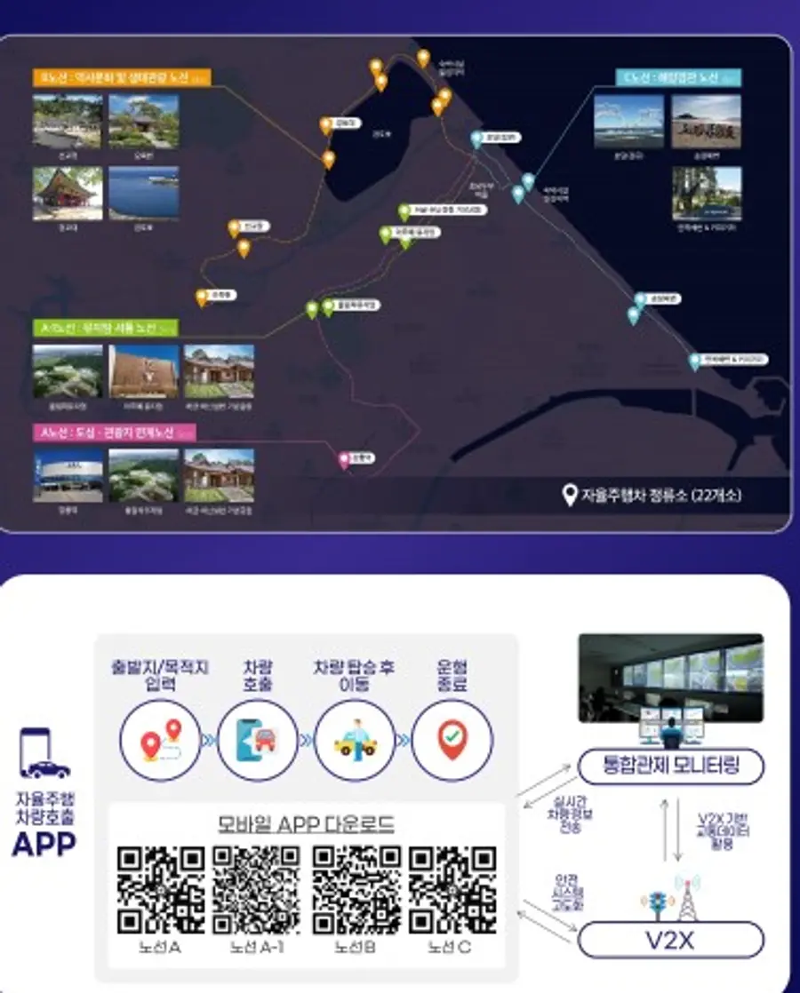 On Route A (5.8km) which connects the city center with tourist attractions and Route C (4km) from Anmok to Gangmun Beach, a modified Carnival self-driving car with two riders and a high-performance camera is operated in front of the vehicle.