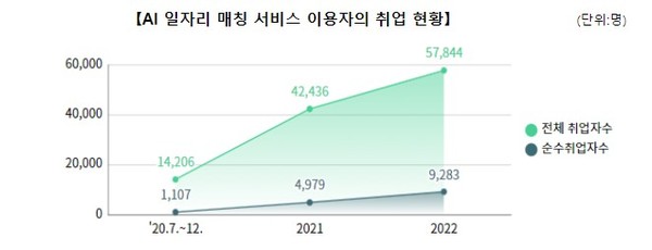 고용노동부(장관 이정식)와 한국고용정보원(원장 나영돈)은 워크넷 인공지능(AI) 일자리 매칭 서비스를 활용한 결과 지난해 전체취업자수가 5만8천명으로 전년비 36.3% 증가했다고 10일 밝혔다.