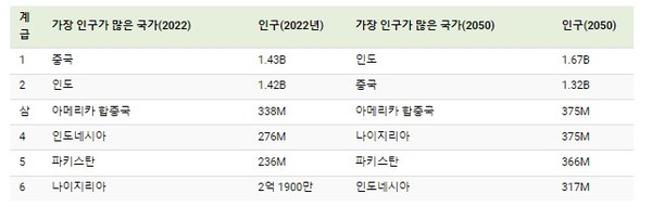 11일 비주얼캐피탈리스트가 UN의 인구 데이타와 프랑스 인구통계학연구소 자료 등을 분석해 2050년까지의 세계 인구 추이를 정리한 기사에 따르면 중국의 인구수는 2022년 현재 14억3천만명으로 1위에 올라있지만 올 연말에는 인도 인구가 중국 인구수를 넘어설 것으로 예상된다. 인도의 현재 인구수는 14억2천망명이다.