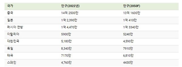 반면 중국, 일본, 러시아, 이탈리아, 한국, 독일, 태국, 스페인 인구수는 계속해 감소세를 보일 전망이다. 지나치게 낮은 출산율이 원인이다.