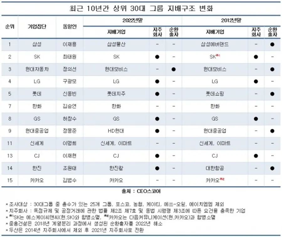 CEO스코어는 특히 국내 주요 그룹 대부분이 지배구조 개편을 통해 고질병인 순환출자 구조에서 벗어난 점이 주목할 만하다고 평가했다.