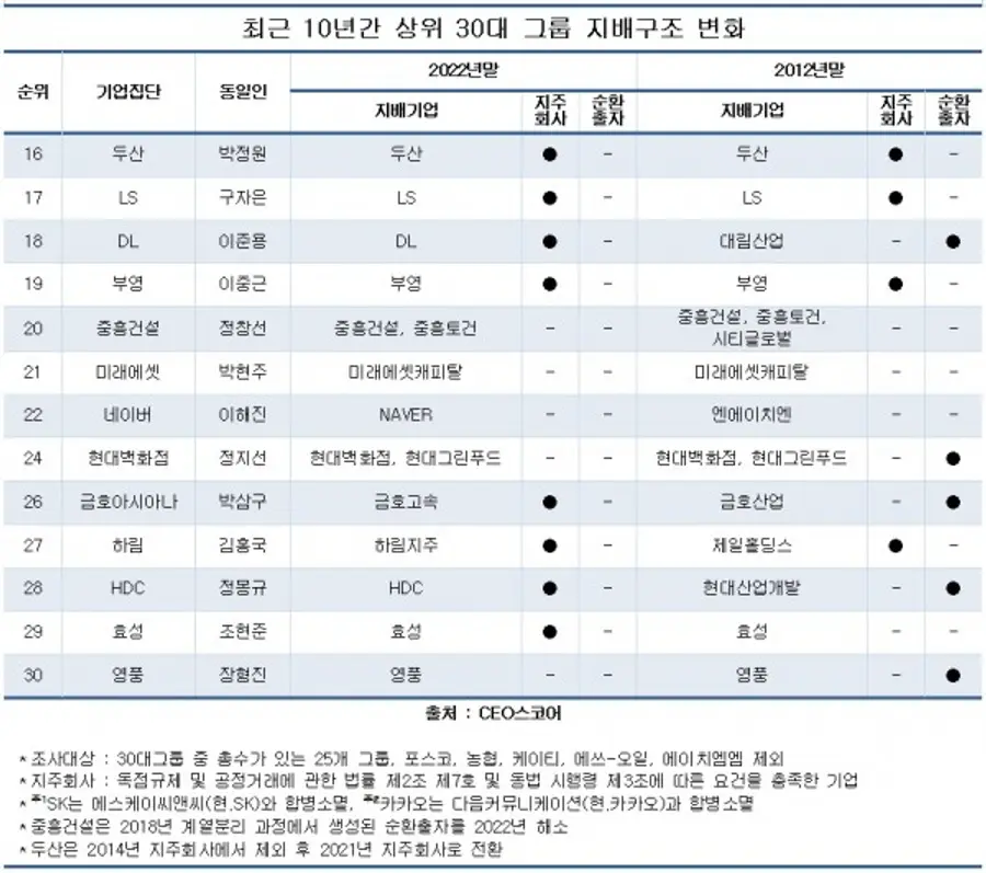 11일 기업데이터연구소 CEO스코어가 2022년 대기업 집단 상위 30곳 중 총수가 있는 25개 그룹을 대상으로 최근 10년 간 지배구조 변화를 조사한 결과, 지주회사 체제를 갖춘 그룹이 지난 2012년 8곳에서 10년간 7곳 늘어 2022년 말 현재 총 15곳으로 집계됐다.